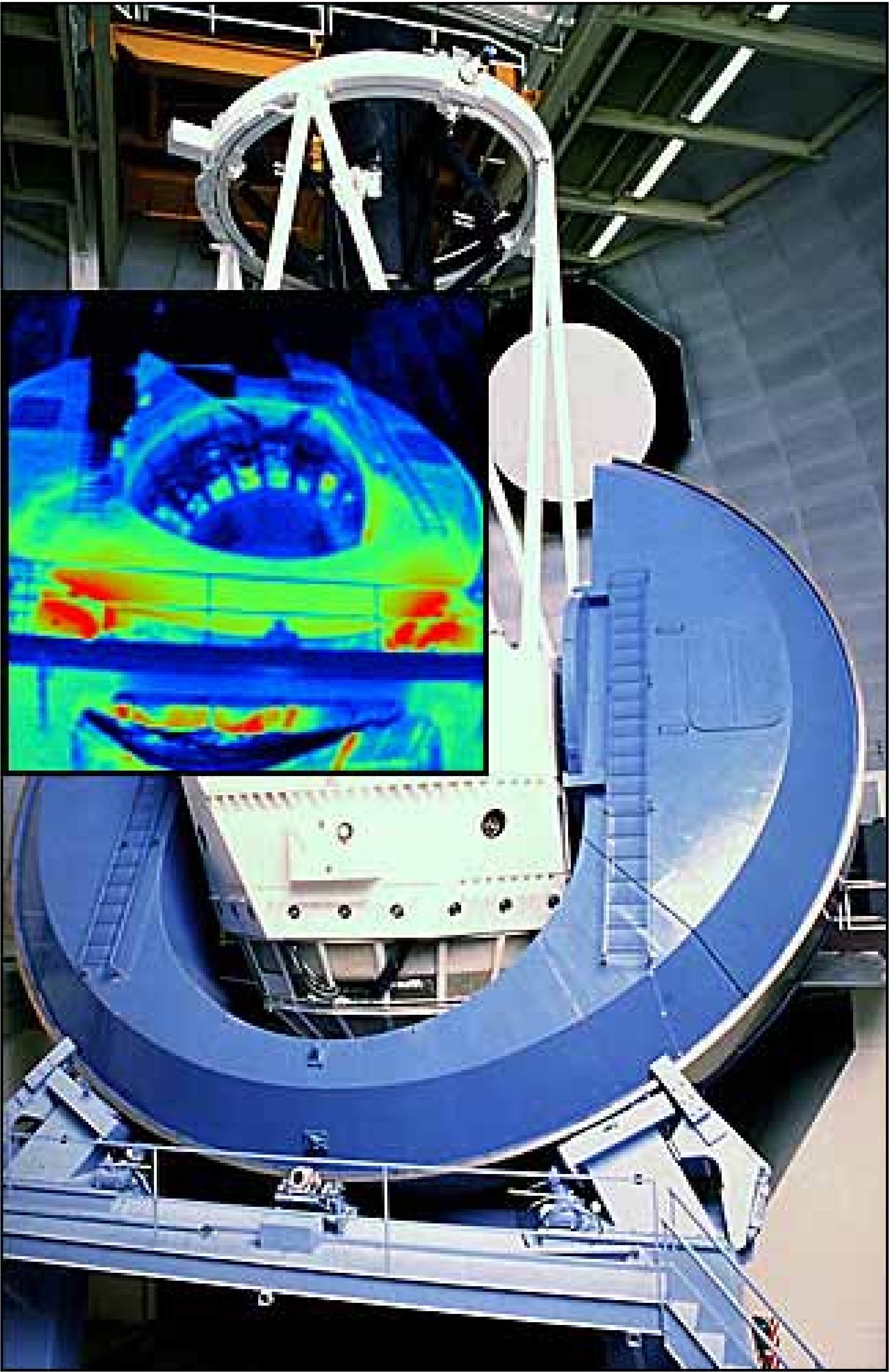 Other extraneous radiation sources are also present. Ground-based Near-IR observations are plagued by background heat radiation from the telescope (e.g. mirrors) and structure (e.g. oil lubricated bearing of horseshoe mounts; see Figure 2.2). The insert image at a wavelength of 10 µm shows temperature changes represented by color differences. Oil lubricated bearings that support the horseshoe mount appear in the infrared image as bright red, representing a 15° C increase in temperature above surrounding structures.